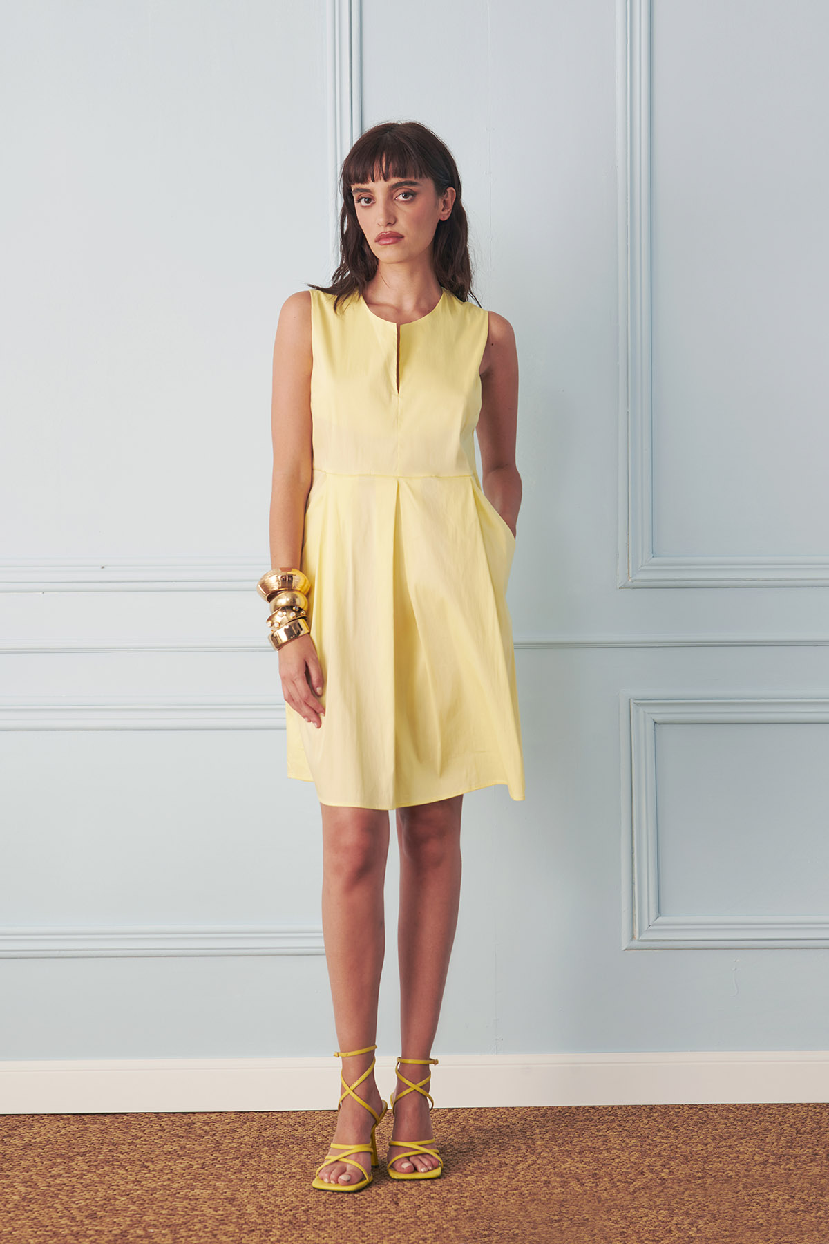 Abito corto realizzato in cotone leggero, fresco e confortevole da indossare. Il modello presenta una scollatura a V sul seno, valorizzata da una piega che parte dalla vita alta e si apre delicatamente sulla gonna.