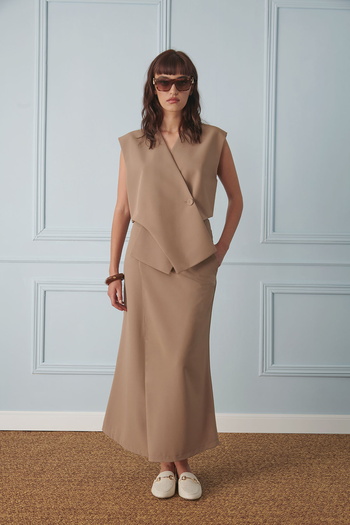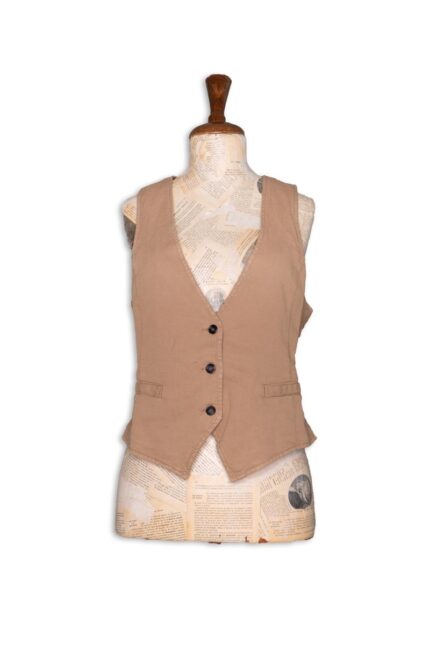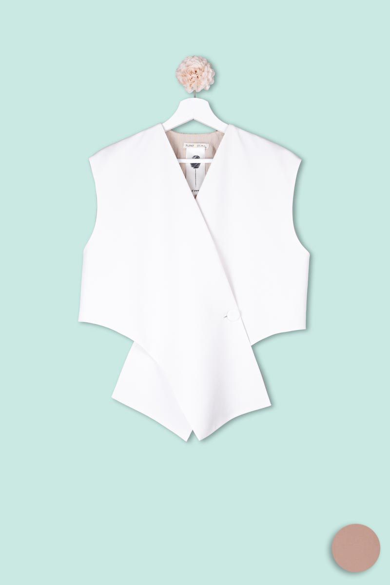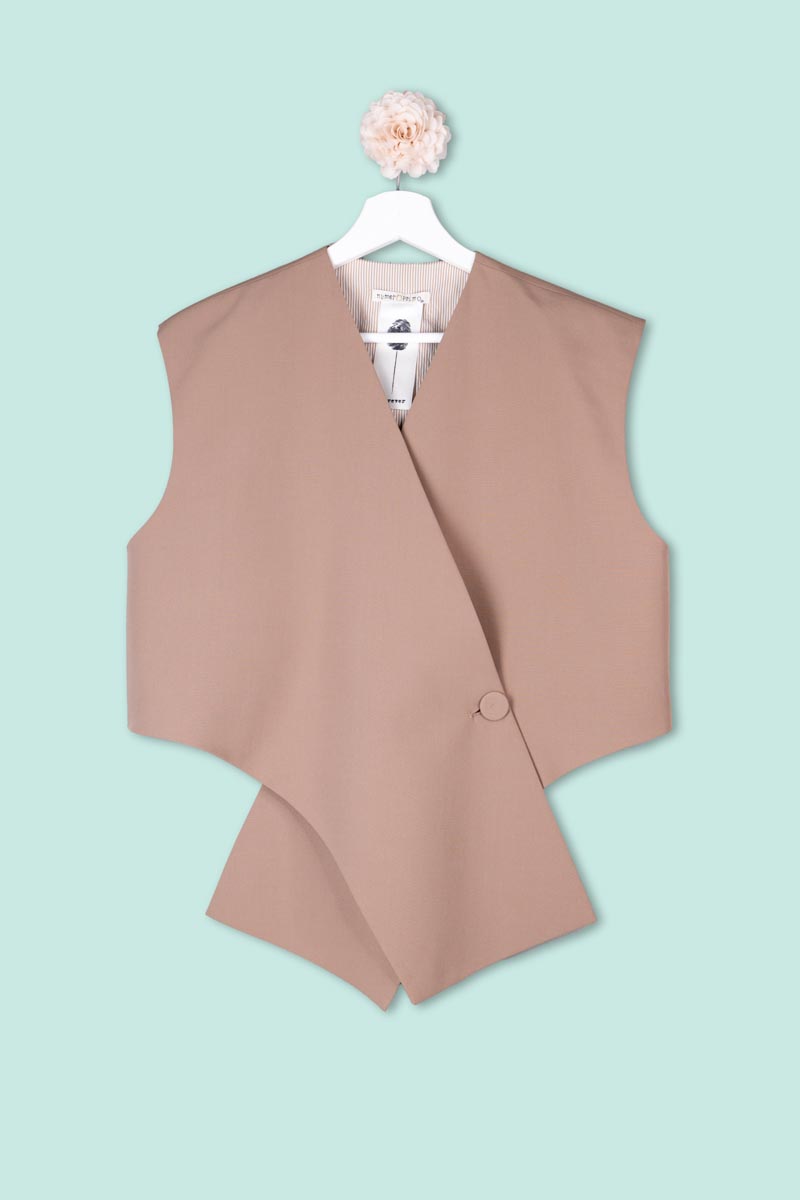 Gilet dal taglio contemporaneo firmato Numero Primo, caratterizzato da una linea incrociata con chiusura laterale che definisce la silhouette con eleganza. Il design essenziale e strutturato valorizza le spalle e crea un effetto avvolgente, sofisticato e femminile.
