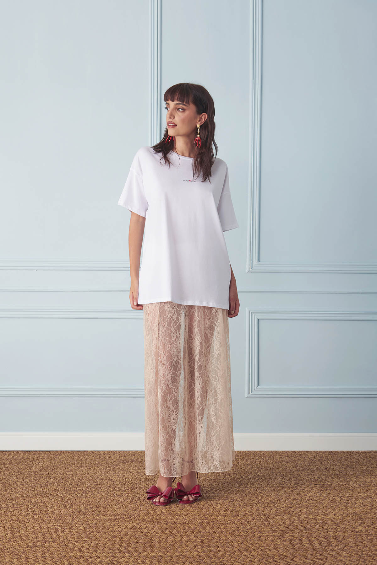 Gonna in jersey di pizzo firmato Numero Primo, dal design essenziale e raffinato.