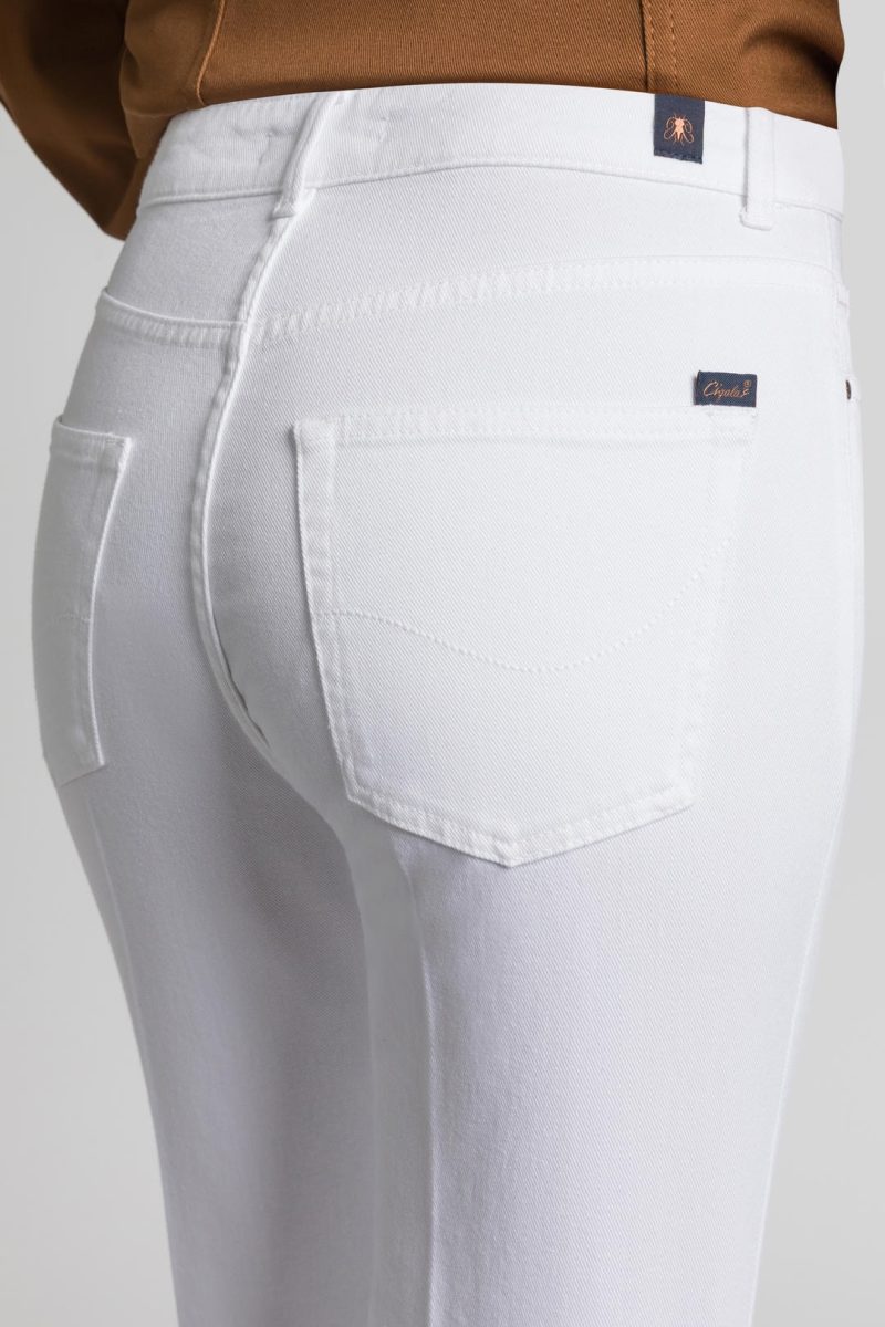Pantalone a vita alta con gamba svasata e lunghezza alla caviglia. Versatile e fresco. Adatto a qualsiasi occasione, è disponibile in versione denim color bianco sabbia.