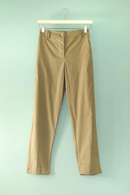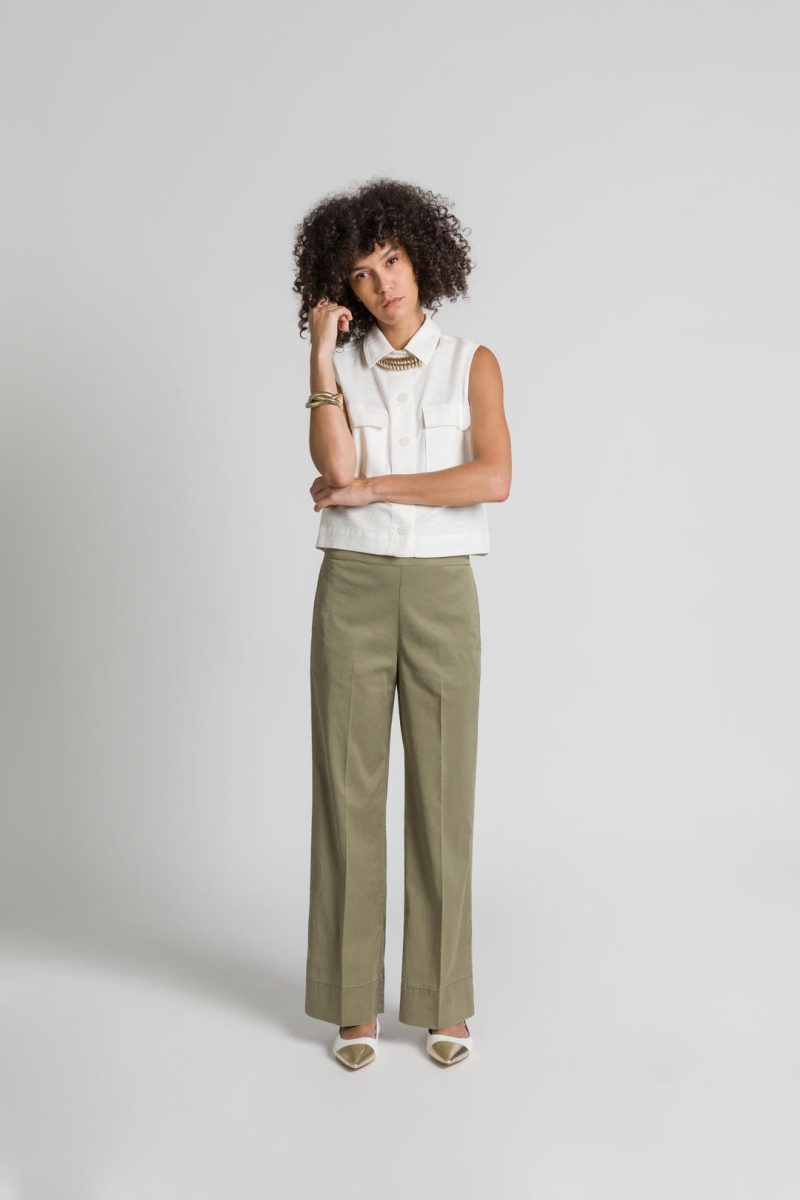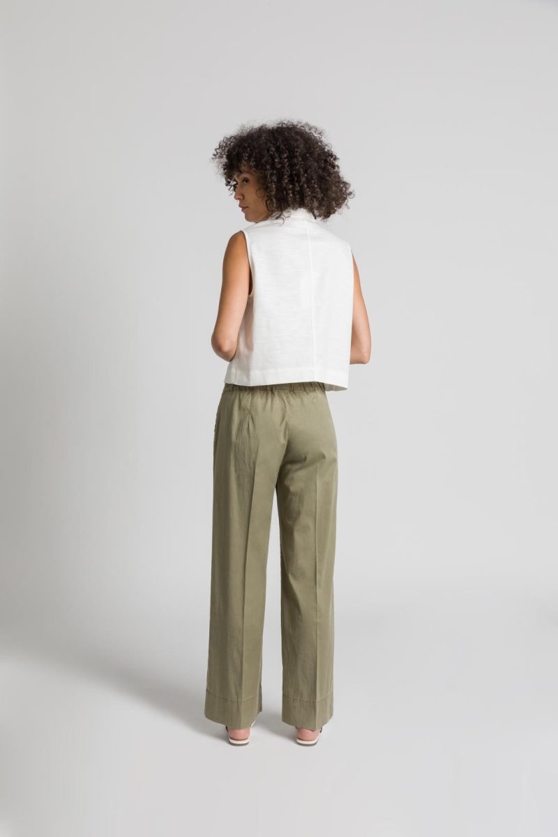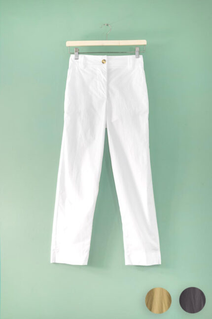 Pantalone dal taglio cropped leggermente svasato al fondo, caratterizzato da una pratica vita elasticizzata e una silhouette essenziale che coniuga comfort e uno stile chic quotidiano.
